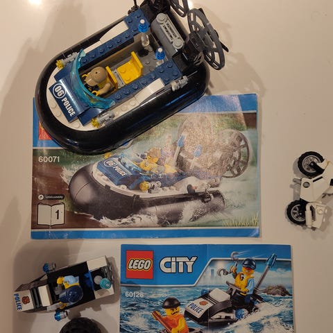 Kuvissa näkyvä lego city poliisiteemaiset legot myynissä. Huomaa, että useat tarrat puuttuvat. Joissain valkoisissa paloissa iäkkäille legoille tyypillistä kellastumista.
