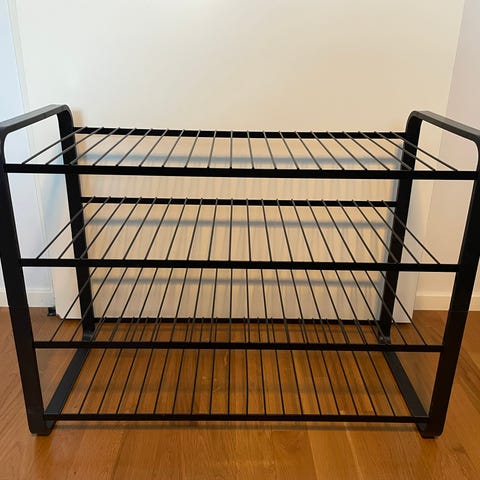 Myydään funkkistyylinen, krominen kenkäteline. Telineen leveys on säädettävissä 64–115 cm.