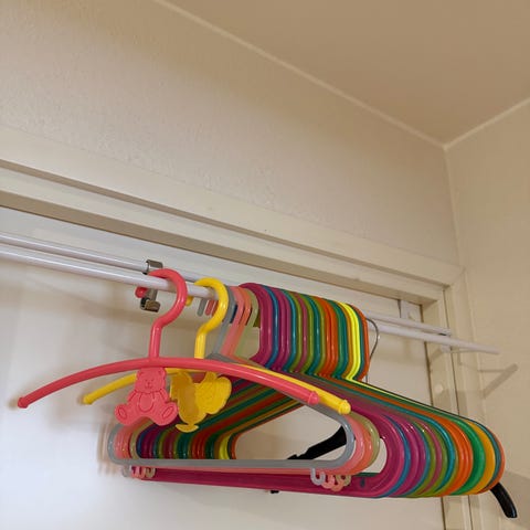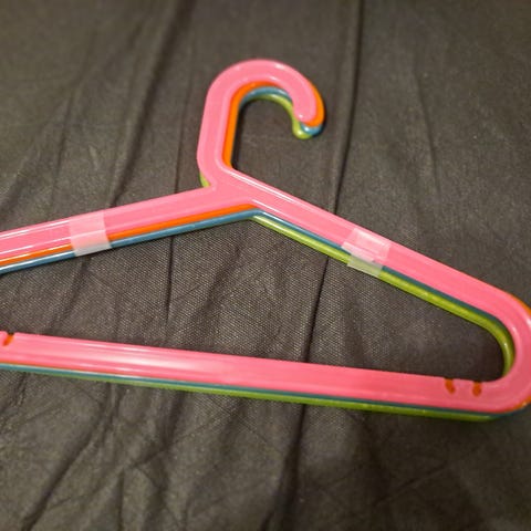 Punainen muovinen lasten vaateripustin, jossa on koukku ja lapsille sopiva koko. Sopii lasten vaatteiden ripustamiseen. 3 kappaletta