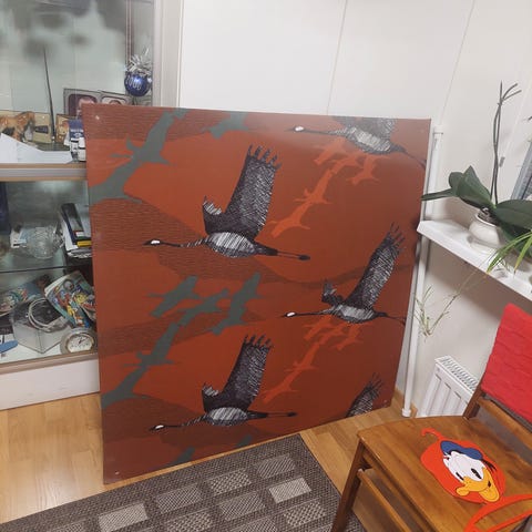 Skandinaaviseen sisustukseen sointuva kangaspintainen taulu (27 cm* 35 cm).
