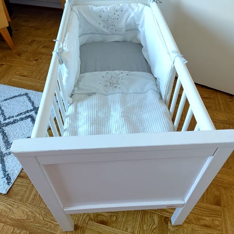 Troll Lux Kehto lasten sänky valkoisella värillä. Kehdossa on renkaat ja kehtoa saa keinutettu. Ollut käytössä 7kk. Mukaan tulee troll alkuperäinen patja ja ikean reunapehmuste, mikä on itse lyhennetty kehtoon sopivaksi. Muistaakseni kehto oli 13kg asti. Pieniä käytön jälkiä löytyy. Patjaa en ole pessyt, koska pelkään että hajoaa. Patja on ollut ulkona pakkasessa muutaman tunnin, pienen haalean läikän löysin (voin tästä kuvan laittaa näin vasta päivänvalossa tämän). Patjan päällä on aina käytetty patjan suojaa ja lakanaa.