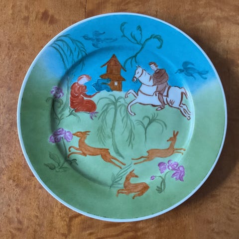 Kultareunainen Punahilkka ja susi -lautanen vintagea. Muutoin siisti ja ehjä, mutta kukkakimpun alapuolelta Punahilkan hameeseen on näkyvissä naarmu. Lautasen halkaisija 17,5 cm.