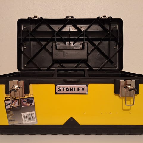 Tästä kestävä työkalulaatikko, jossa metalliset lukkosalvat.