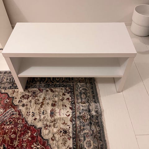 IKEA TV-taso, valkoinen väri, mitat noin 120x40 cm. Varustettu kahdella laatikolla ja kahdella avoimella hyllyllä. Sopii media- ja viihdelaitteiden säilytykseen.