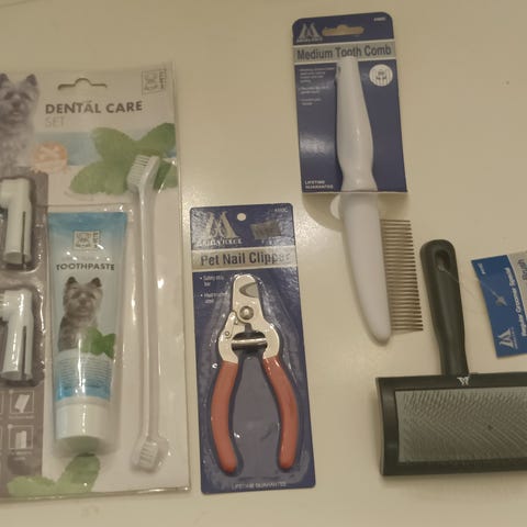 Kuvassa näkyvät kääpiösnautserilla käytössä olleet hoitotarvikkeet mm. turkin- ja kynsienhoitoon sekä kaulapanta.