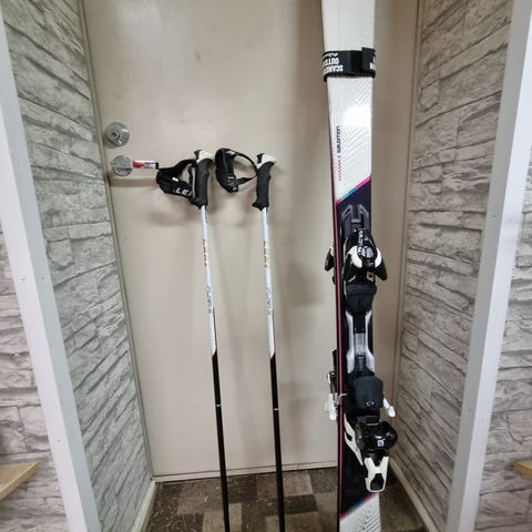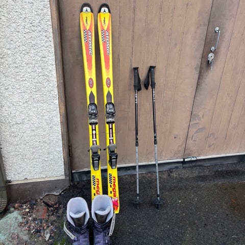 Vähälle käytölle jääneet ja ikäänsä nähden hyväkuntoinen laskettelusuksipaketti