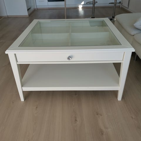 Ikean liatorp. Käytetty ja kulunut, ei valittamista arkikäytössä tosin. Jos viitsii hioa ja maalata kulmat saa hyvännäköisen taas. En oo itse jaksanut. Koira ei kuulu kauppaan, eikä tavarat pöydän sisällä. Vain nouto!