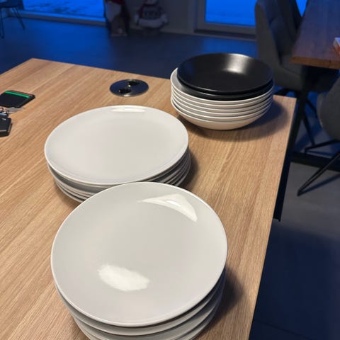 Myynnissä IKEAn valkoisen/vaaleanharmaan värisenä 4kpl kahvikuppeja, 4kpl leipälautasia, 4 kpl matalia lautasia ja 4 kpl syviä lautasia.
