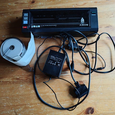 HiTi - tulostin ja tarvittavat kaapelit. Laite on ollut käytössä vuosina 2005- 2010.