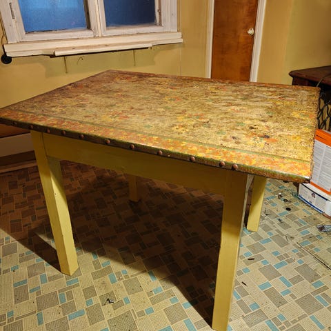 Kuvien mukainen puupöytä, pöydässä jatkopala, joka on jalkojen värinen. Pöytä toisessa paikassa, kysyn mitat tarvittaessa.