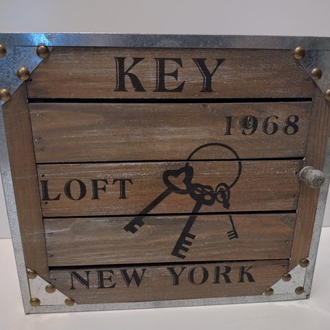 Metallinen avainkaappi, joka tarjoaa järjestelmällisen tavan säilyttää avaimet. Sisältää useita avainkoukkuja avainten ripustamiseen ja lukittavan oven turvallisuutta varten. Väri vaalea, materiaali metalli.