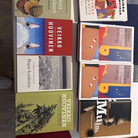Veikko Huovisen varhaista ja myöhempää kirjallista tuotantoa kova- ja pehmeäkantisina kirjoina.