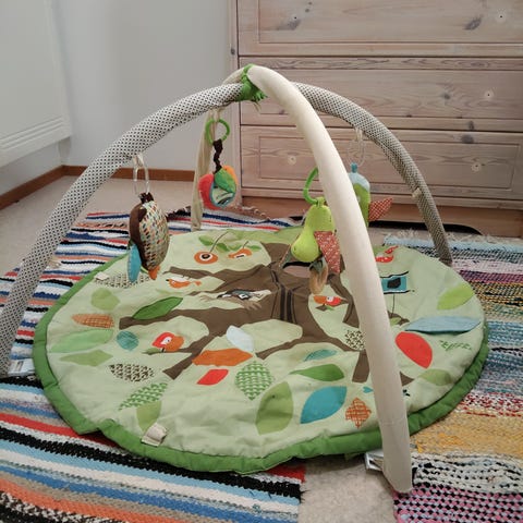 Done by Deer Aktiviteettimatto lasten leluilla, jossa pehmeä alusta ja ripustettavat lelut eri muodoissa. Sopii vauvoille ja pienille lapsille motoristen taitojen harjoitteluun ja viihdykkeeksi.