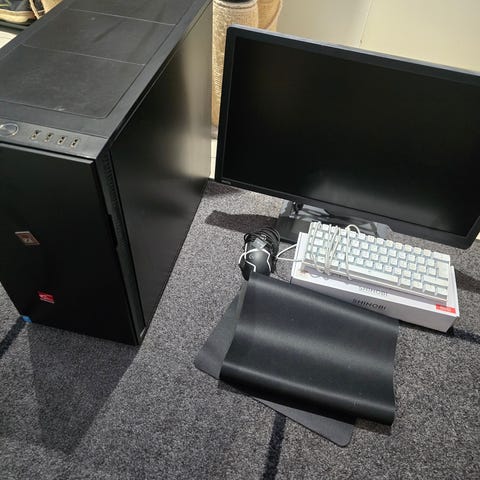 Valmis setti pelaamiseen. Pelikone, näyttö, hiiri ja mekaaninen näppäimistö.