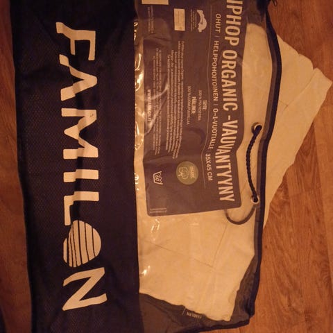 Familonin laatua. Tässä tyynyssä on tukea jo hiukan niskallekin, koko noin 35x55 (tyynyliina 40x60). Taapero- ja leikki-ikäiselle passeli.