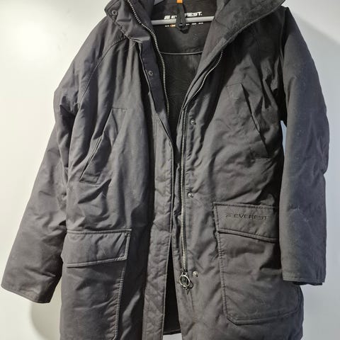 Lämmin ulkotakki, Everst-merkkinen. Stadium mainostaa monia takkejaan tuulta- ja vettähylkiväksi. Uskoisin tämänkin olevan sellainen, vaikka ei enää sellaisenaan löydykään Stadiumin mallistosta. Hupussa karvareunus. Edessä vetoketju ja napitukset. Paljon taskuja. Nouto Lukonmäestä.