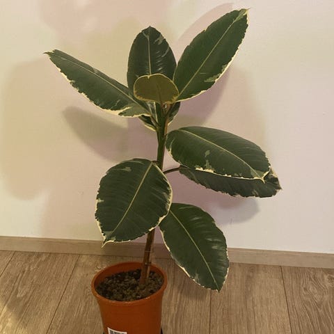 Ficus elastica 'Ruby' on huonekasvi, jossa on suuret, tummanvihreät lehdet punertavilla sävyillä. Kasvi on istutettu ruukkuun ja sopii sisätiloihin koristekasviksi.