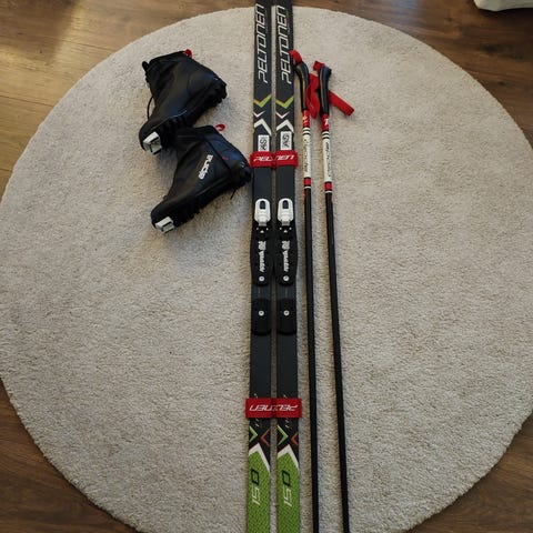 Peltosen Nanogrip sukset 150, Oneway sauvat ja Alpina NNN monot 36