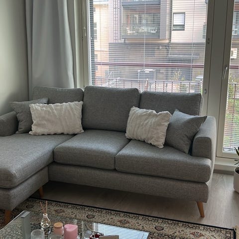 Loistokuntoinen ehjä ja puhdas laatusohva + rahi Alcantara kankaalla. Ryhdikäs sohva, joka on ollut väjällä käytöllä. Ei lemmikkejä taloudessa. Leveys 270 ja syvyys 92, divaanin syvyys 145. Rahi 77x62.