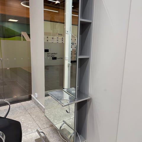 Takana itse rakennettu hyllykkö sähkötarvikkeille ja käyttötuotteille, jotka ovat näin lähellä, mutta siististi poissa näkyviltä. Voidaan käyttää myös pelkkänä peilinä. 50€/kpl