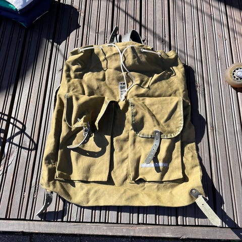 Kankainen reppu, jäänyt käyttämättä. Luonnonvaalea ja vihreä, ruskeat yksityiskohdat.