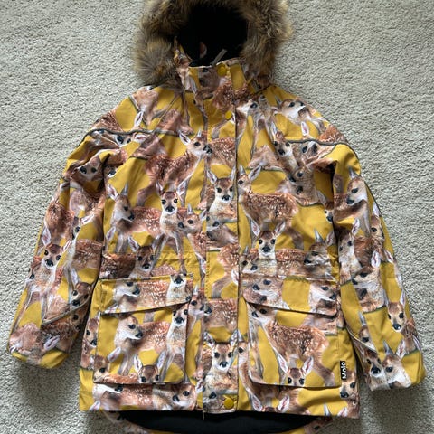 Muiden takkien ohella säästeliäästi käytetty Molon kaunein kuosi. Pesty max kerran eli ominaisuudet tallella. Hihansuissa (kts kuvat) lähinnä pientä käytönjälkeä. Mittoja: kai-hiha 44, kai-kai 48 ja niska-helma 62 cm.