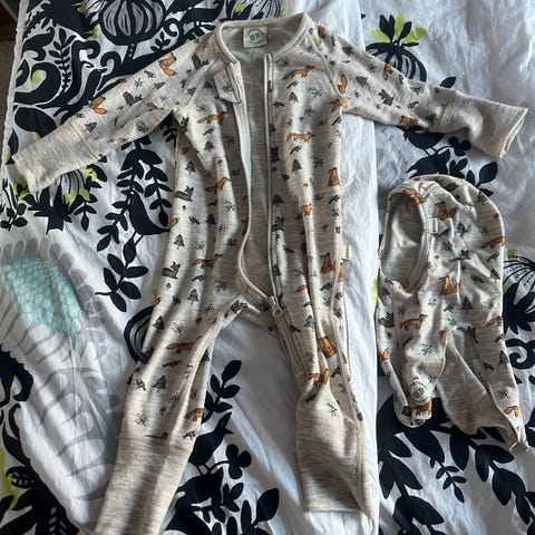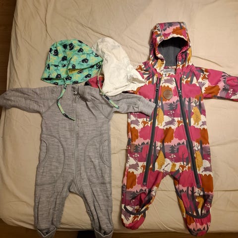 Myydään lasten haalari (80%villaa), valkoiset töppöset ja hanskat, kypärämyssy (puuvillaa), hatut (villaa ja merinovillaa).