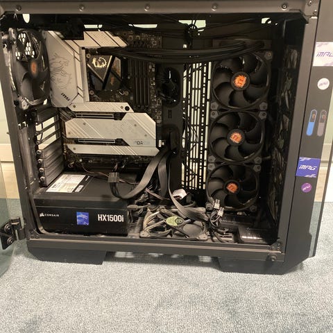 Erillisistä komponenteista kasattu tietokone ja näyttö. Tietokoneessa on seuraavat komponentit: