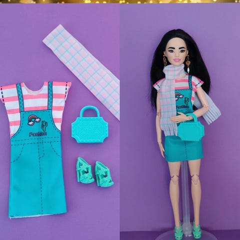 Pinkki joustava toppi. Joustavat ruskea-mustat housut. Ruskeamusta kassi, johon mahtuu Barbien kenkiä n. 8 paria/tilavuus (kengät ei myynnissä).
