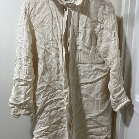 Nanso pellava tunika taskuilla. Käyttämätön, laput kiinni ovh ollut 89 €. Säilytyksestä ryppyinen. Ylhäältä ja alhaalta hukkunut nappi mystisesti ( 2 kpl?). Pientä kokoa.