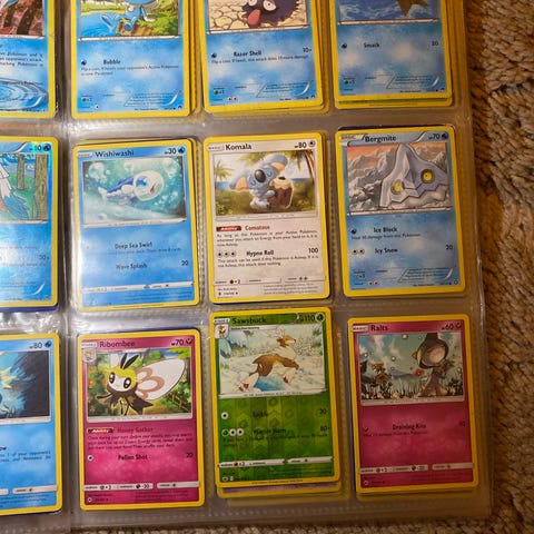 Kokoelma Pokémon-kortteja, sisältäen erilaisia hahmoja ja ominaisuuksia. Kortit ovat eri tasoisia ja eri tyyppejä, sopivat korttipelien pelaamiseen tai keräilyyn. Koko sivu eli 9 korttia 5€!!