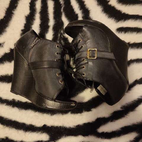 Mustat gootti tyyliset korkokengät, kenkien sisällä kissankarvoja.