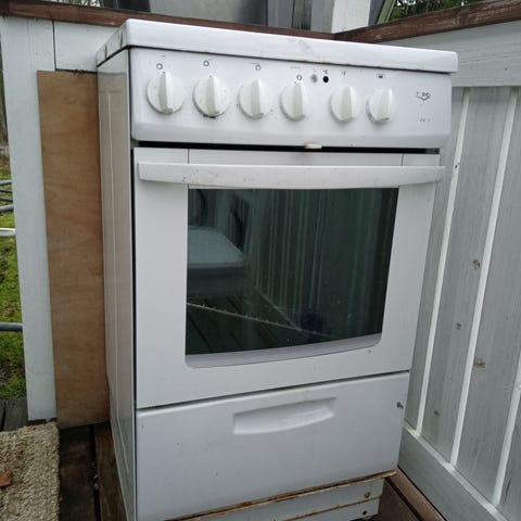Annetaan kuvassa oleva toimiva, 50 cm leveä liesi uuden tieltä. Yksi napeista rikkoutunut ja korvattu uudella eriparisella.