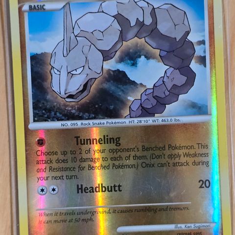 Pokémon Onix keräilykortti. Kortissa on kuva Onix-hahmosta ja sen hyökkäys Rock Throw, joka tekee 10 vahinkoa.