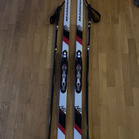 Madshus Multigrip -pitopohjasukset 140 cm ja sauvat 104 cm. Madshusin kehittämä suomupinta pitoalueella. Rottefellan nnn-siteet. Muutaman kerran hiihdelty. Vain nouto Arabianrannasta.
