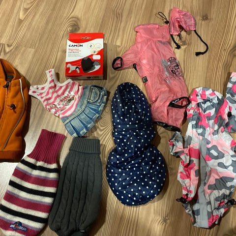 Tarvikepaketti pienelle koiralle. Myydään vain settinä. Tarvikkeiden pesu ja puhdistus jää seuraavalle.