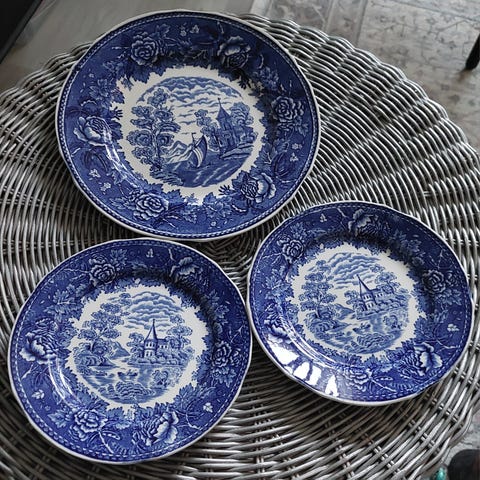 Arabia Sininen Maisema ruokalautanen Landscape-leimalla. Lautasen halkaisija 25 cm. Lautanen on täysin ehjä ja lasite naarmuton. Painokuva hiukan epäterävä.
