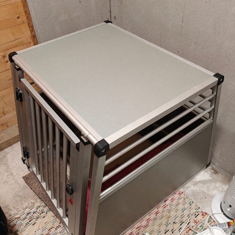 Kevyt ja vakaa koirahäkki alumiinia ja MDF:ää. Kalteva edestä ja takaa, sopii hyvin auton tavaratilaan. Säleikkö takaa hyvän ilmanvaihdon ja näkymän ulos. Helppo pitää puhtaana.
