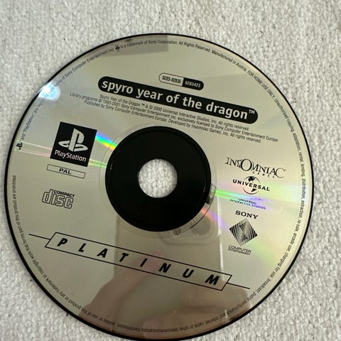 PS1-peli Spyro 2, Platinum-versio. Heikossa kunnossa - kotelo aika lailla päreinä, ohjeet puttuu ja levy on pahasti naarmuilla. Sen verran testattu, että pelin intro ja aloituskenttä toimivat ok, mutta musiikit ja audio-dialogit pätkivät. Kokeiltu Pleikkari kolmosella.