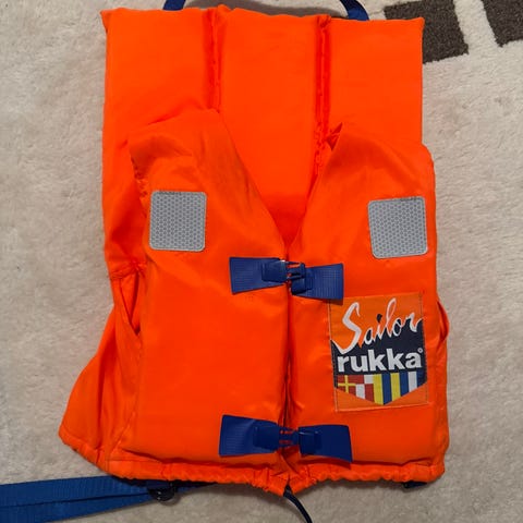 Marinepool pelastusliivi oranssissa värissä, varustettu mustilla säädettävillä hihnoilla ja lukolla. Pelastusliivissä on myös kova vihellin ja heijastimet näkyvyyden parantamiseksi.