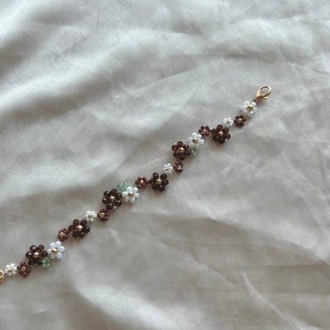 Käsintehty rannekoru helmillä. Saatavilla myös hopeisilla metalliosilla ja helmillä. Viimeisissä kuvissa näkyy, miltä malli näyttää ranteessa. Kapeampi rannekoru ostettavissa erikseen.