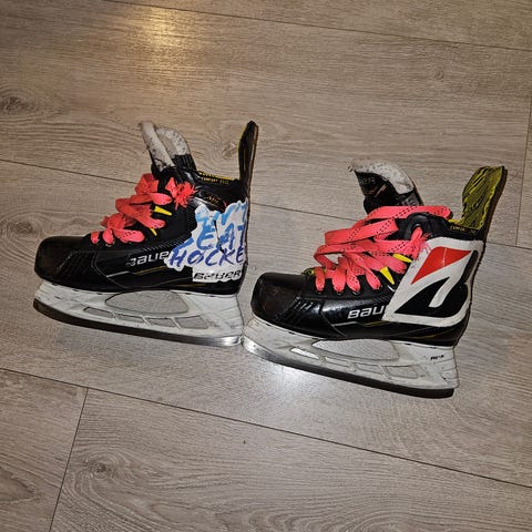 Bauer lasten jääkiekkoluistimet, koko 32. Luistimissa on musta ja punainen väri, ja ne on suunniteltu jääkiekkokäyttöön.
