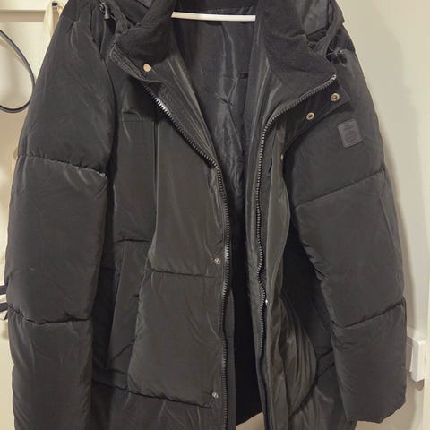 Lämmin musta talvitakki. Huppu ja tekoturkiskaulus ovat irrotettavat, joten takkia voi käyttää tarpeen ja sään mukaan. Todella siistissä kunnossa, vain vähän käytetty.