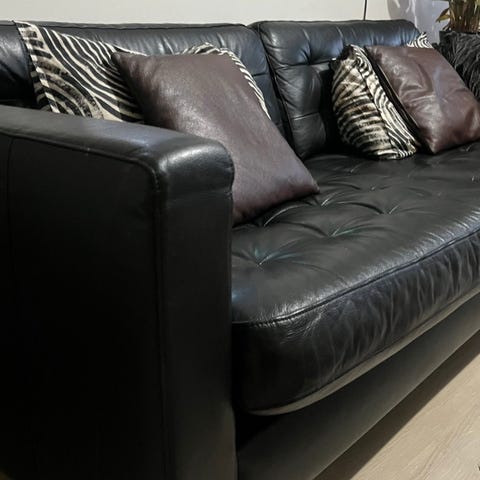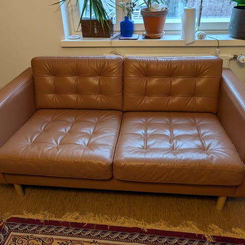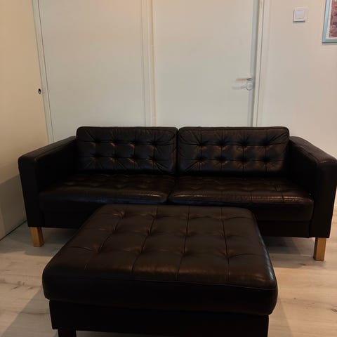 Ikean landskrona 3:n istuttava nahkasohva ja ikea landskrona nahkanojatuoli, molemmat hyvässä kunnossa eikä mitään vikoja