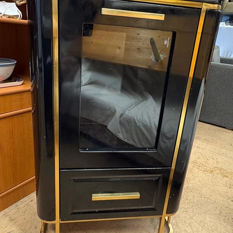 Baarikaappi on uudenveroisessa kunnossa. Kaikki ovet ja avautuvat hyvin ja pinnat ovat siistit. Baarikaappi koostuu kahdesta osasta ja se on helppo koota: asetat vain osat päällekkäin.