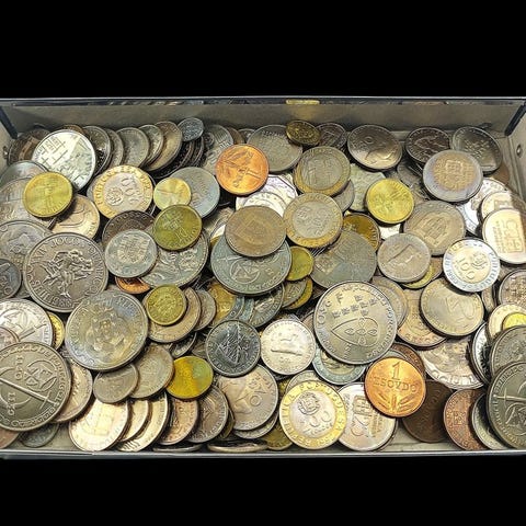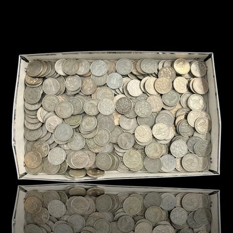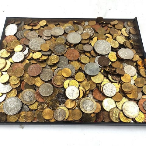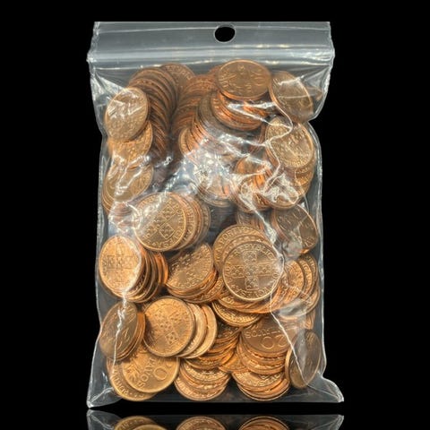 Erä 2 pussia kolikoita, vielä pankin sulkemia, 10 sentin alumiinikolikoita, ei kiertäneitä vuosilta 1974–1975.