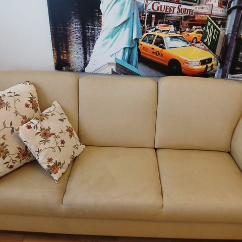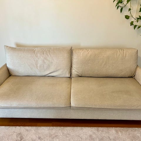Sohva on vähän istuttu, koska ollut meillä alakerrassa koristeena! Päällisiäkään ei ole koskaan pesty!