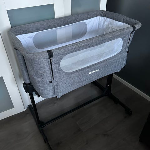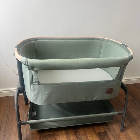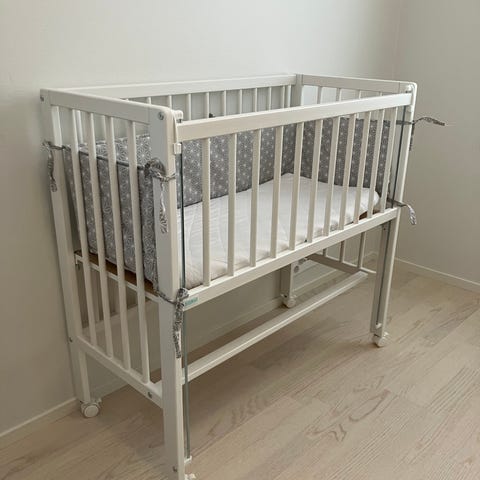 Sängyn yhden laidan saa helposti laskettua ja pohjan nostettua/laskettua sopivalle tasolle. Jalkoihin kiinnitetyt pyörät on aiemman omistajan toimesta vaihdettu hiljaisempiin, 3 pyörää saa lukittua niin, että sänky pysyy paikallaan vaikka vanhempien sängyn vieressä. Kiinnitysremmi puuttuu.