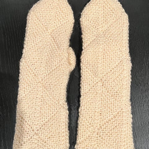 Aikuisen lapaset, mittoja kuvissa. Sininen ja luonnonvalkoinen lanka. Nouto Lämsänjärveltä tai Toridiili. Kissatalous.