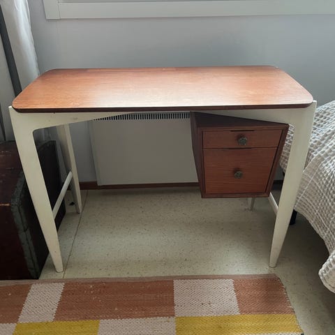 Tyylikäs 50/60-luvun kampauspöytä myytävänä. Suunnittelija Kurt Hvitsjö. Peili ehjä ja irroitettava. Yleiskunto ikäisekseen hyvä. Jaloissa ja kannessa pientä jälkeä. Vetolaatikot toimivat. Sisustassa jälkiä. Ei hajuja. Runko kaikin puolin tukeva.